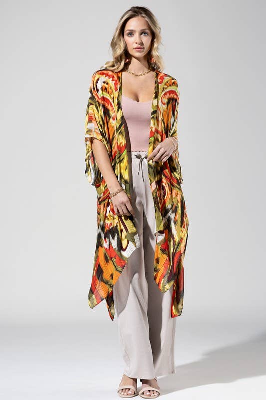The Ruggine Bohemian Motif Kimono features a vibrant, free-spirited print accented with stripes for the perfect mix of bold and timeless. Designed with side slits for easy movement, this lightweight layer drapes effortlessly over any look—making it your go-to piece for everything from brunch to beach days.