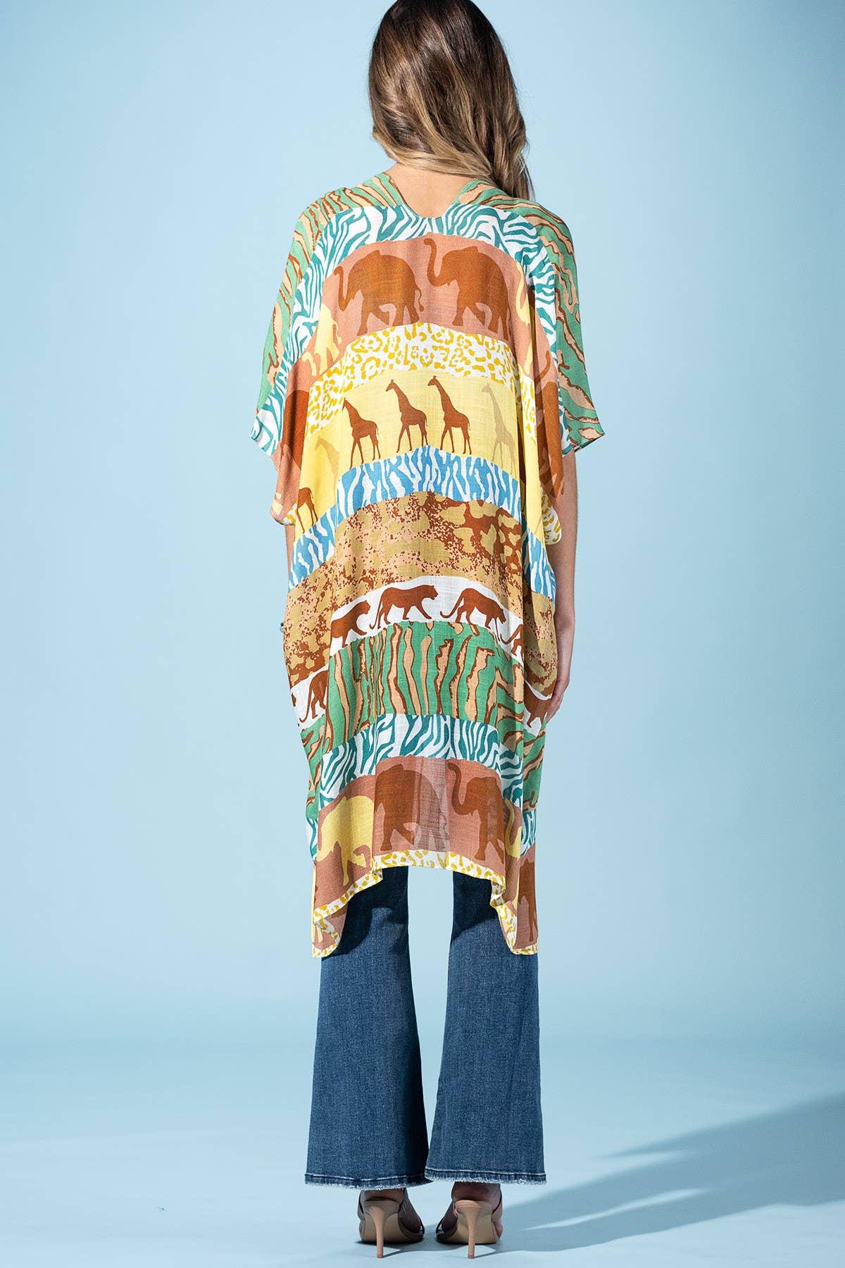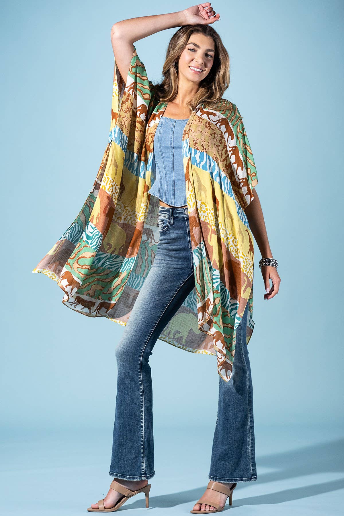 A wearable canvas layered with color, texture, and movement, the Safari Sunrise Kimono blends golden yellows, warm oranges, soft greens, and cool blue accents into an expressive mix of animal motifs and abstract patterning. Lightweight with an easy open front and fluid drape, it adds instant depth and personality to simple outfits while remaining effortless and wearable. Bold yet balanced, this statement piece feels collected, artistic, and designed to be noticed without trying too hard.
