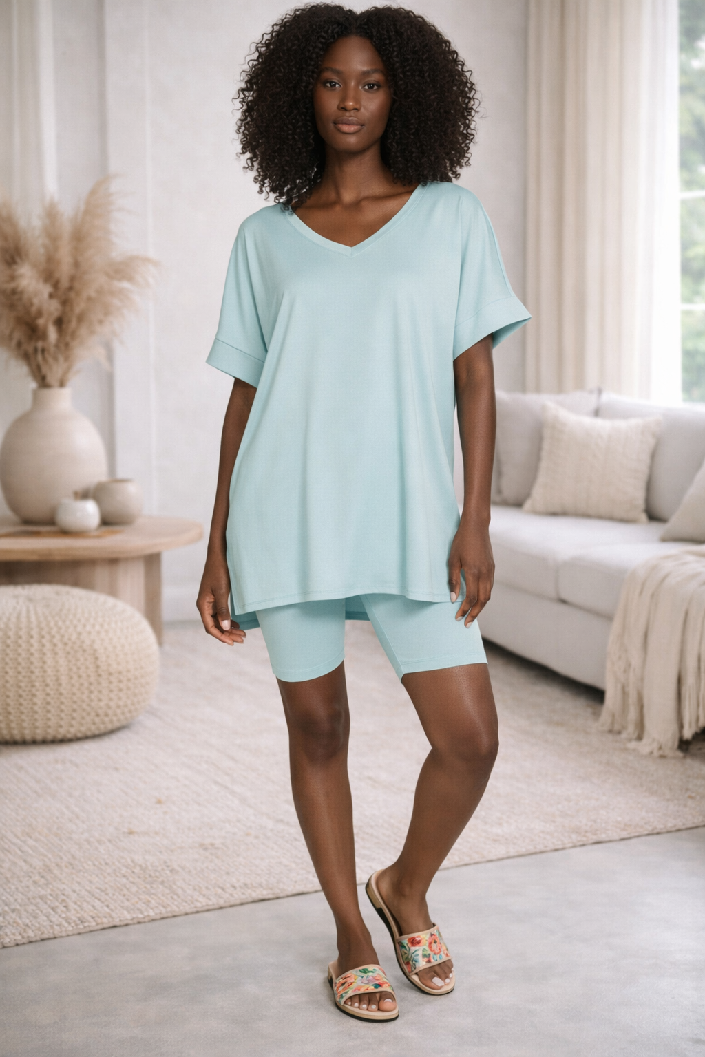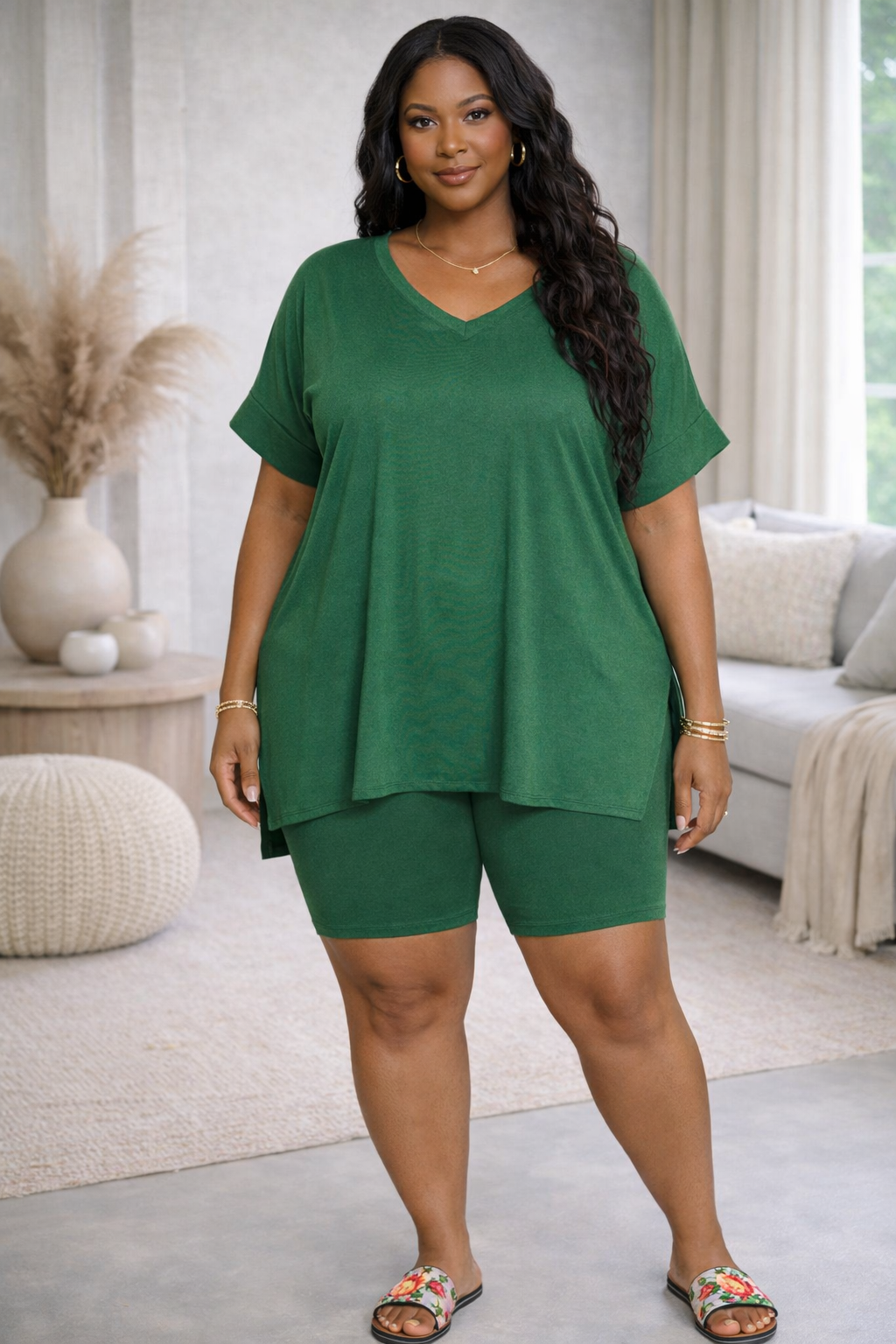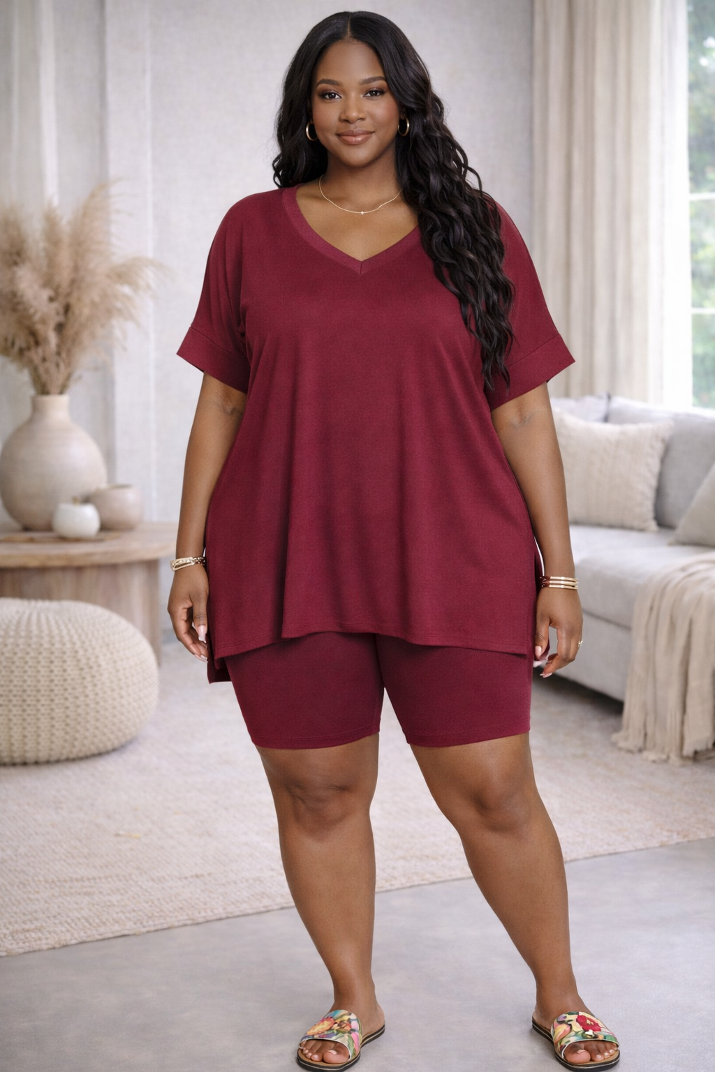 Meet your new go-to set for effortless comfort and everyday confidence. This plus-size brushed DTY microfiber two-piece set features a flattering V-neck hi-low hem top paired with buttery-soft biker shorts. Designed to move with you, this set delivers the perfect balance of stretch, softness, and style — ideal for lounging, running errands, traveling, or casual days when comfort is non-negotiable.
