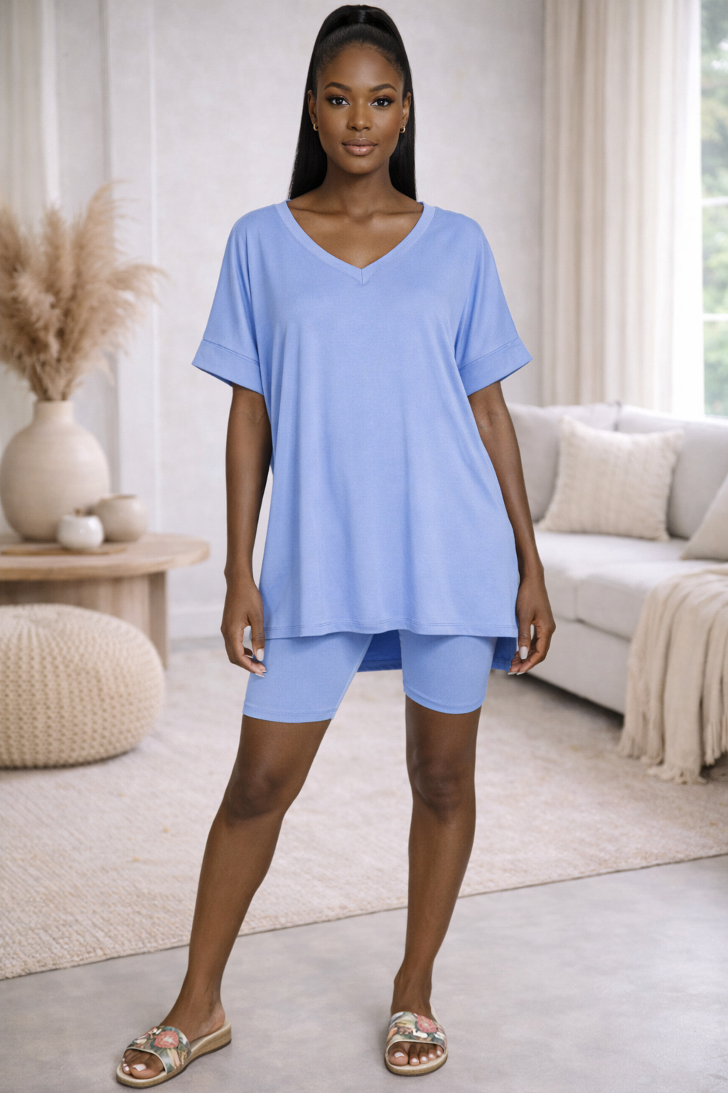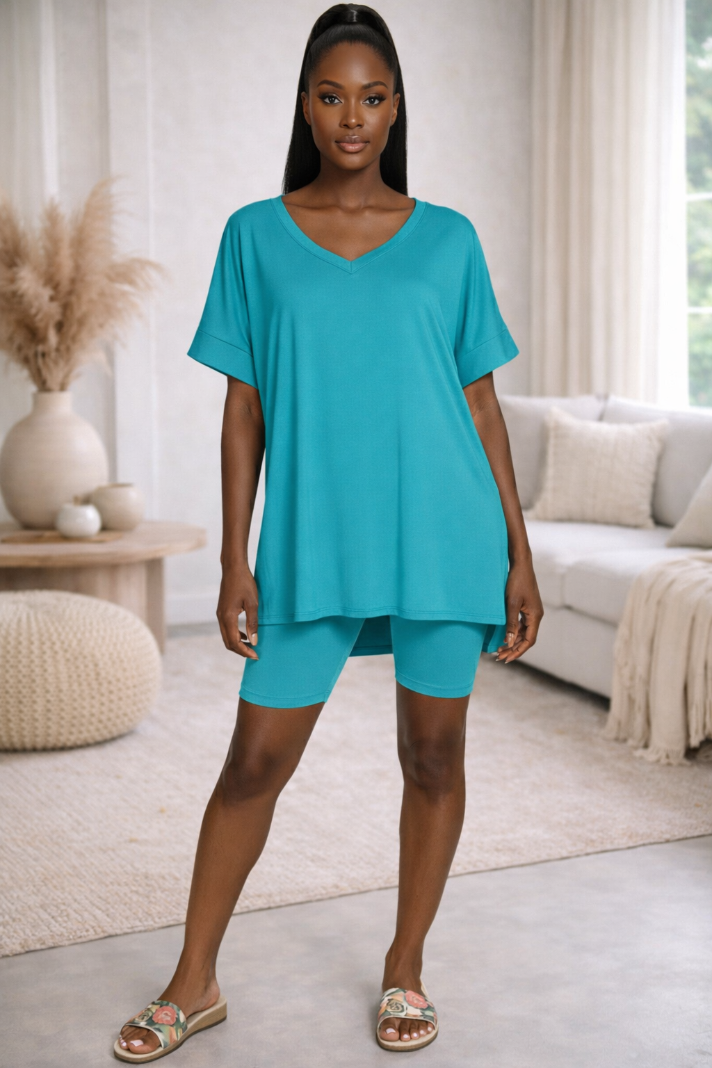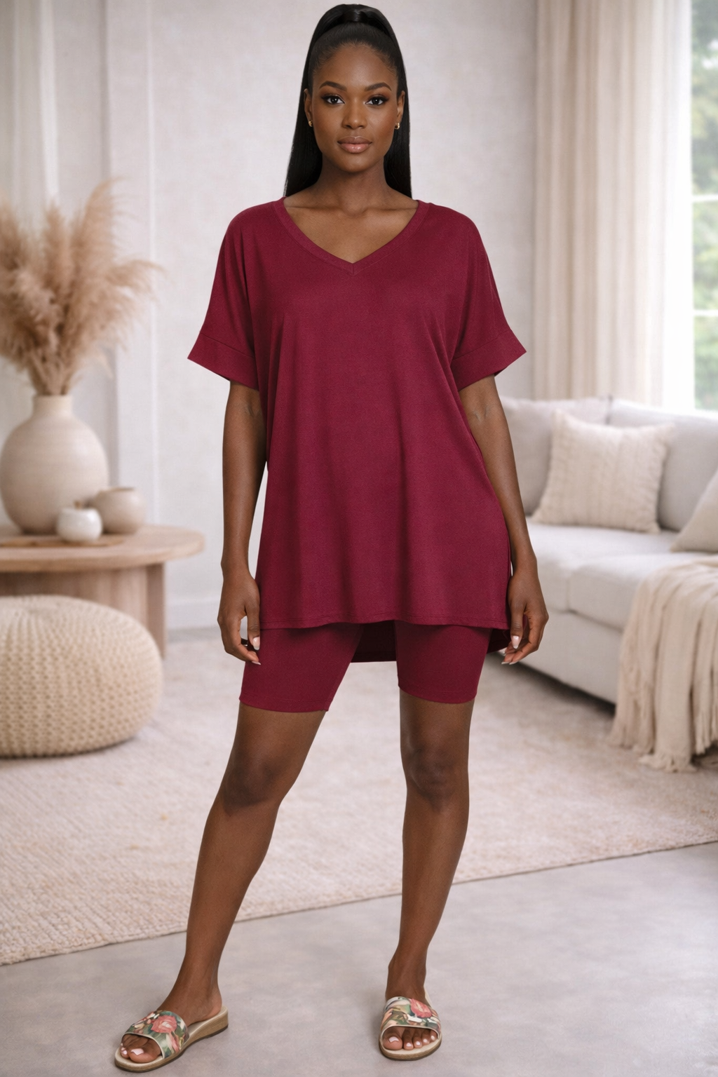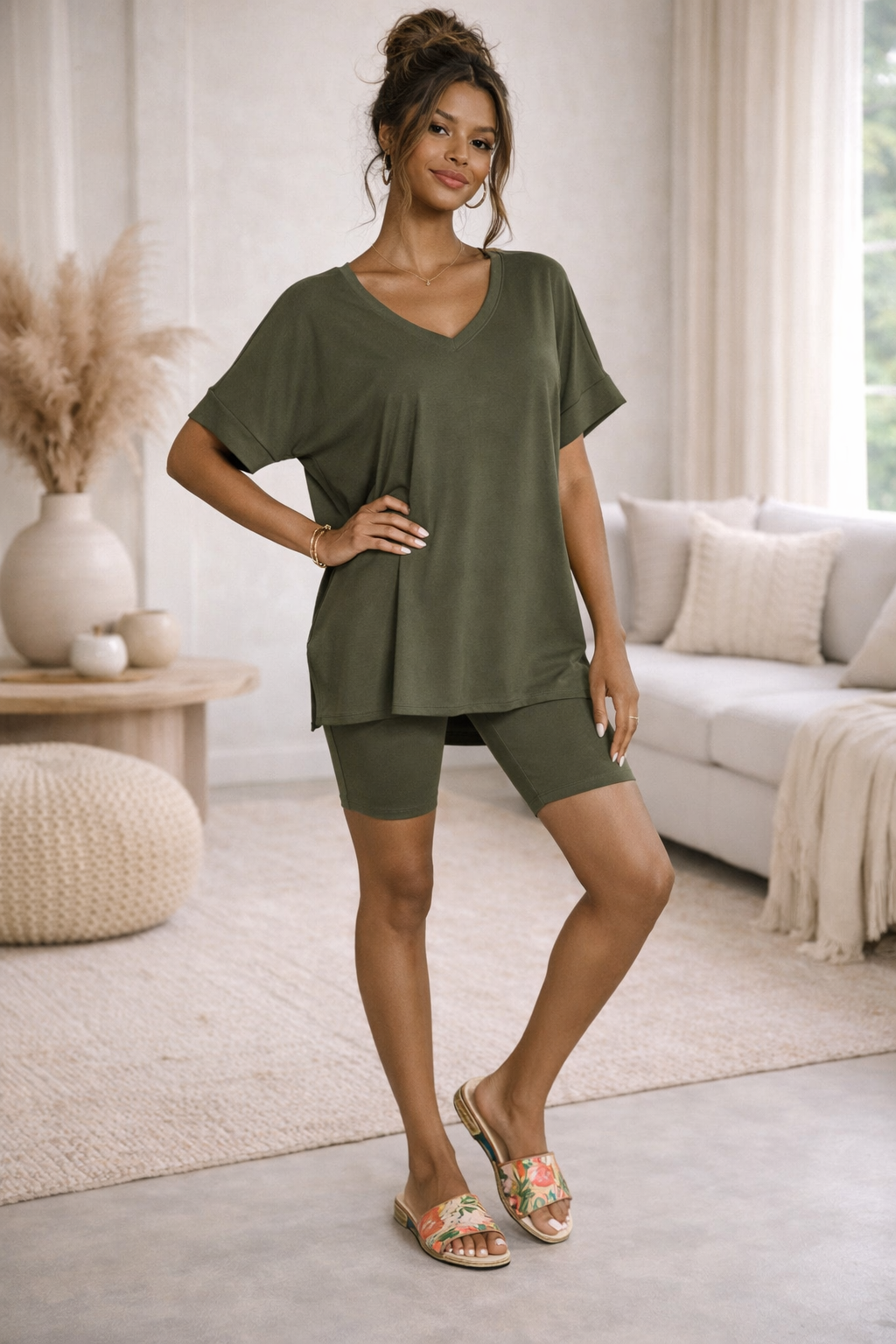 Meet your new go-to set for effortless comfort and everyday confidence. This plus-size brushed DTY microfiber two-piece set features a flattering V-neck hi-low hem top paired with buttery-soft biker shorts. Designed to move with you, this set delivers the perfect balance of stretch, softness, and style — ideal for lounging, running errands, traveling, or casual days when comfort is non-negotiable.
