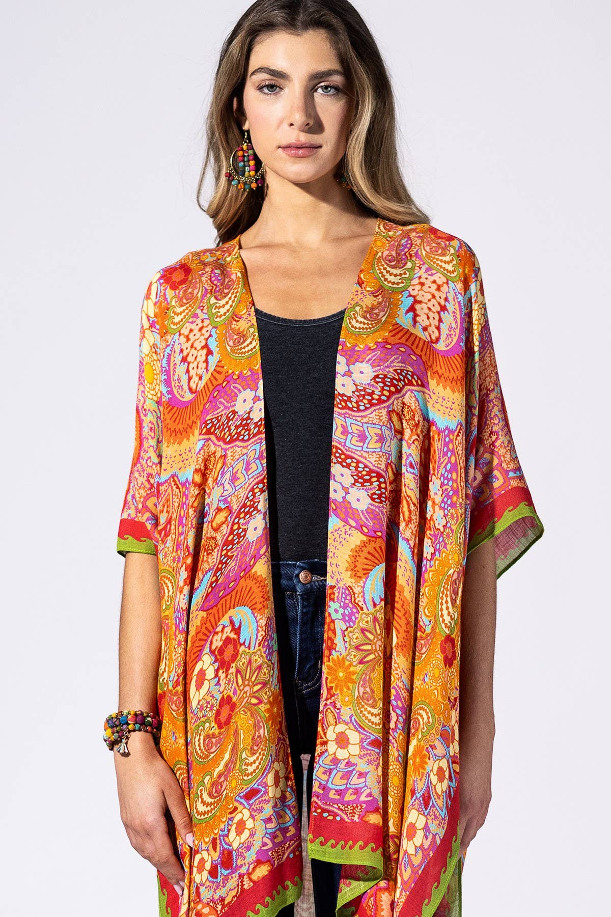 This Kimono features a bold, fiery mix of orange and red florals designed to make an impact. Cut in a relaxed square-body silhouette, it drapes effortlessly for an easy, flowy fit. A contrasting border frames the edges, giving structure to the vibrant floral print. Crafted from lightweight 100% viscose, this kimono moves beautifully and works as a striking layer for both everyday wear and statement styling.