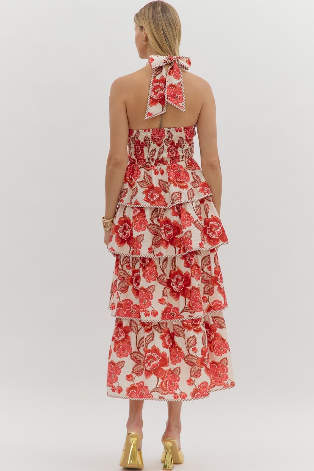 The Floral Halter Tie Midi Dress brings summer glam without the fuss. Featuring a feminine bow-tie halter neckline, tiered skirt, and a smocked back for easy fit and comfort, this lightweight woven dress is lined, non-sheer, and trimmed in bold contrast binding that adds just the right edge.