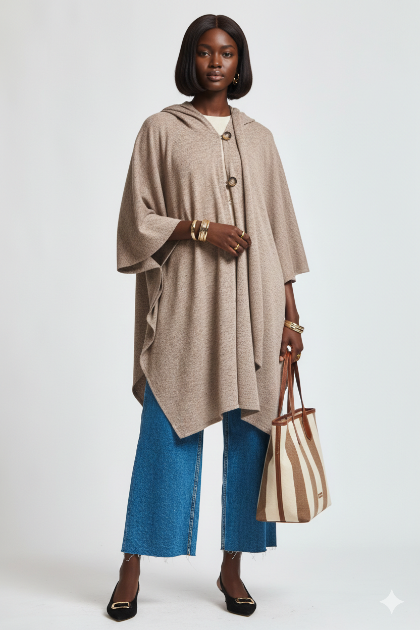 Subtle button details add just the right amount of charm, giving this poncho an elevated finish that works for both casual and dressed-up moments. It’s the perfect throw-on piece for days when you want to feel comfortable and put together without thinking too hard.