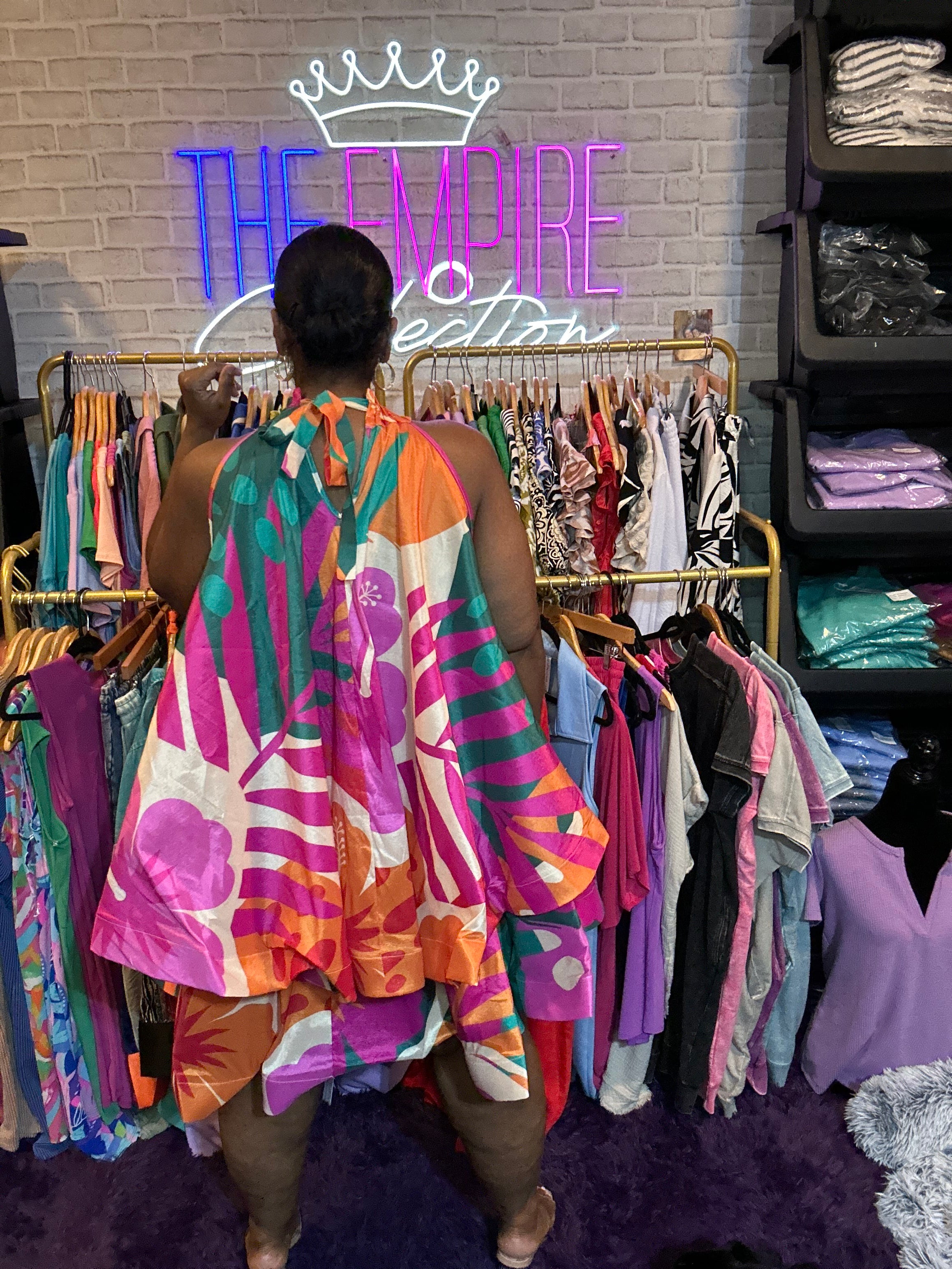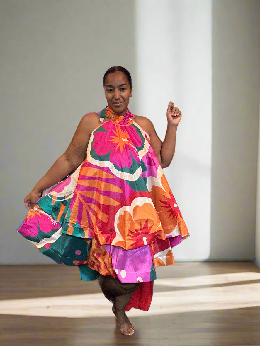 Turn heads without even trying. Our Halter Ruffle Dress is giving tropical goddess energy with a bold, vibrant print that does all the talking. Featuring a high halter neckline, flirty ruffle trim, and a flowy silhouette that moves with you—this sleeveless stunner was made for sunny days, date nights, and vacay slay.