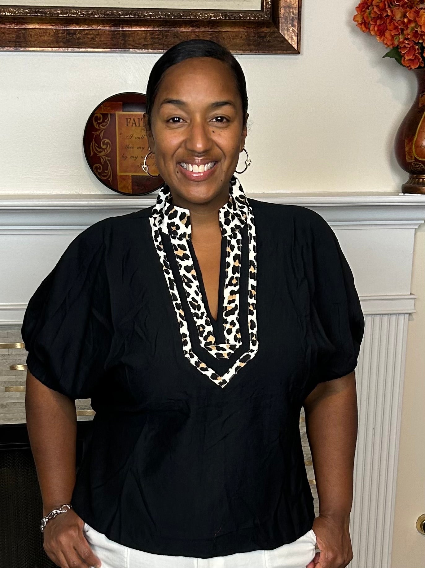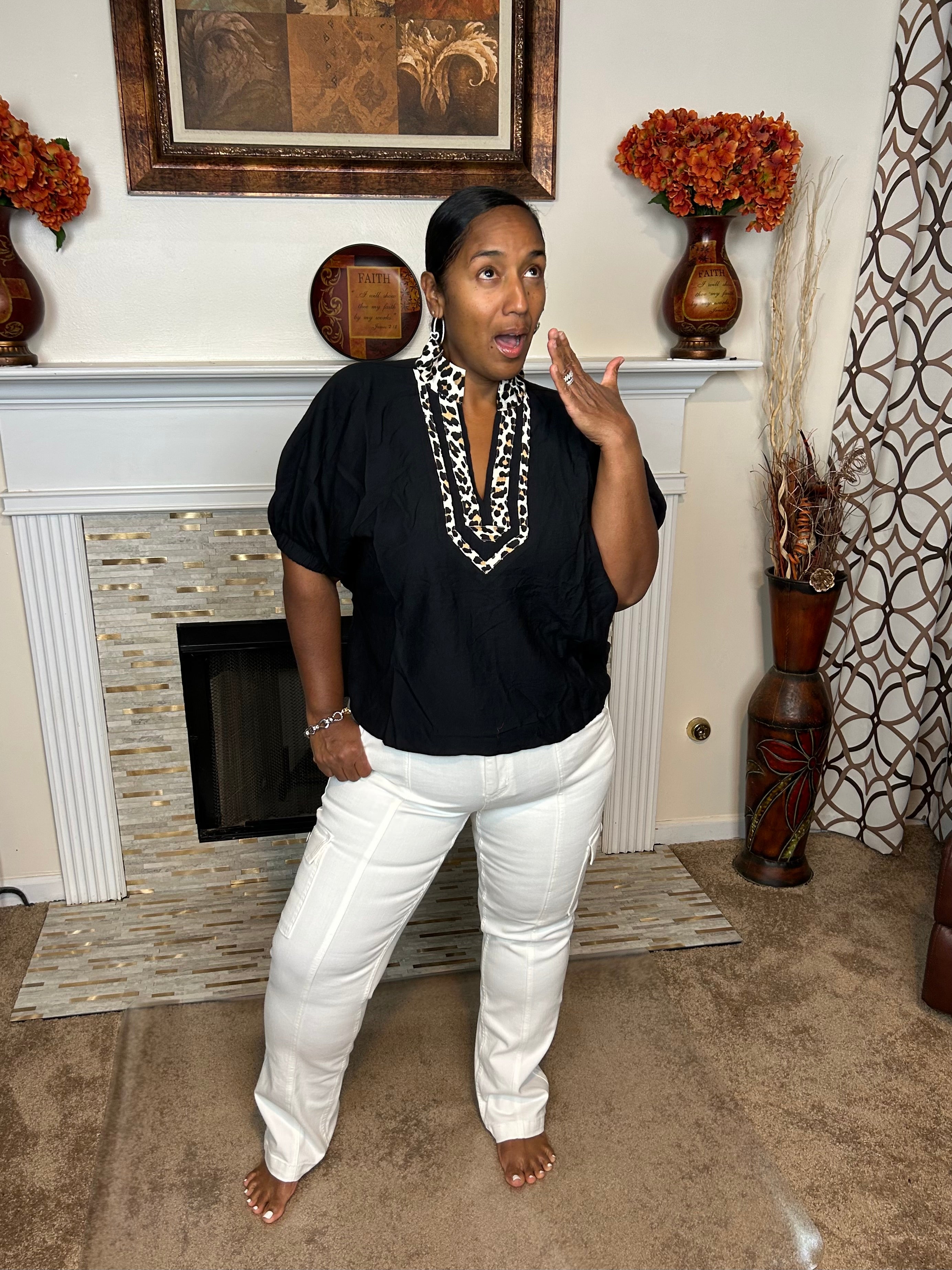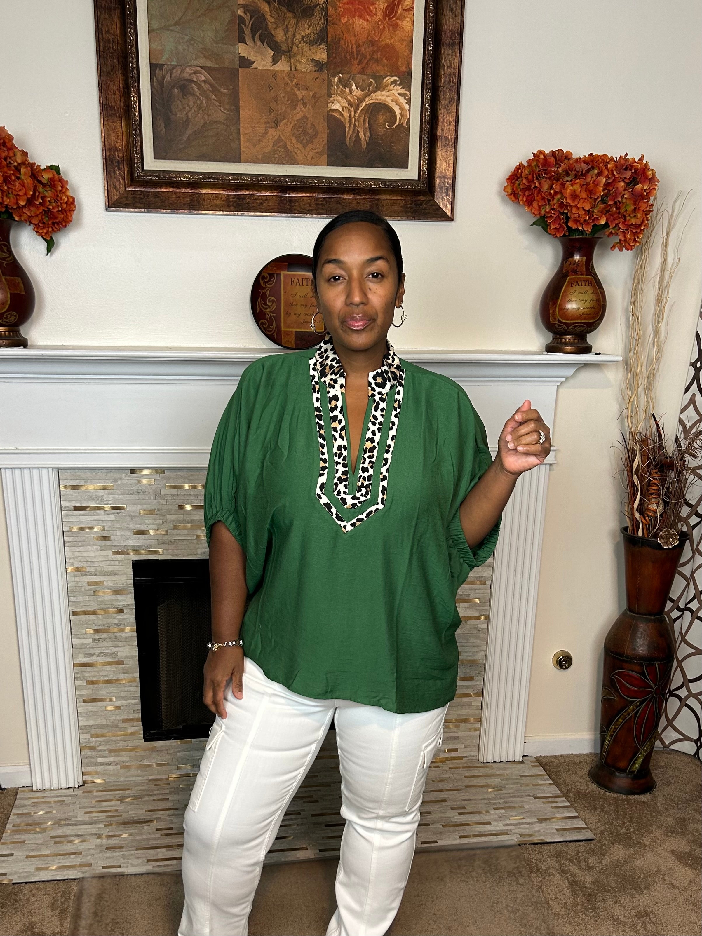 The Leopard Accent Dolman Top is your new power blouse with a playful twist. Featuring a caftan-inspired split neckline trimmed in leopard print and wide dolman sleeves with elasticated cuffs, this top gives breezy confidence with just the right edge. Made from a lightweight woven fabric that’s non-sheer and drapes effortlessly, it’s the statement piece you didn’t know your closet was missing.
