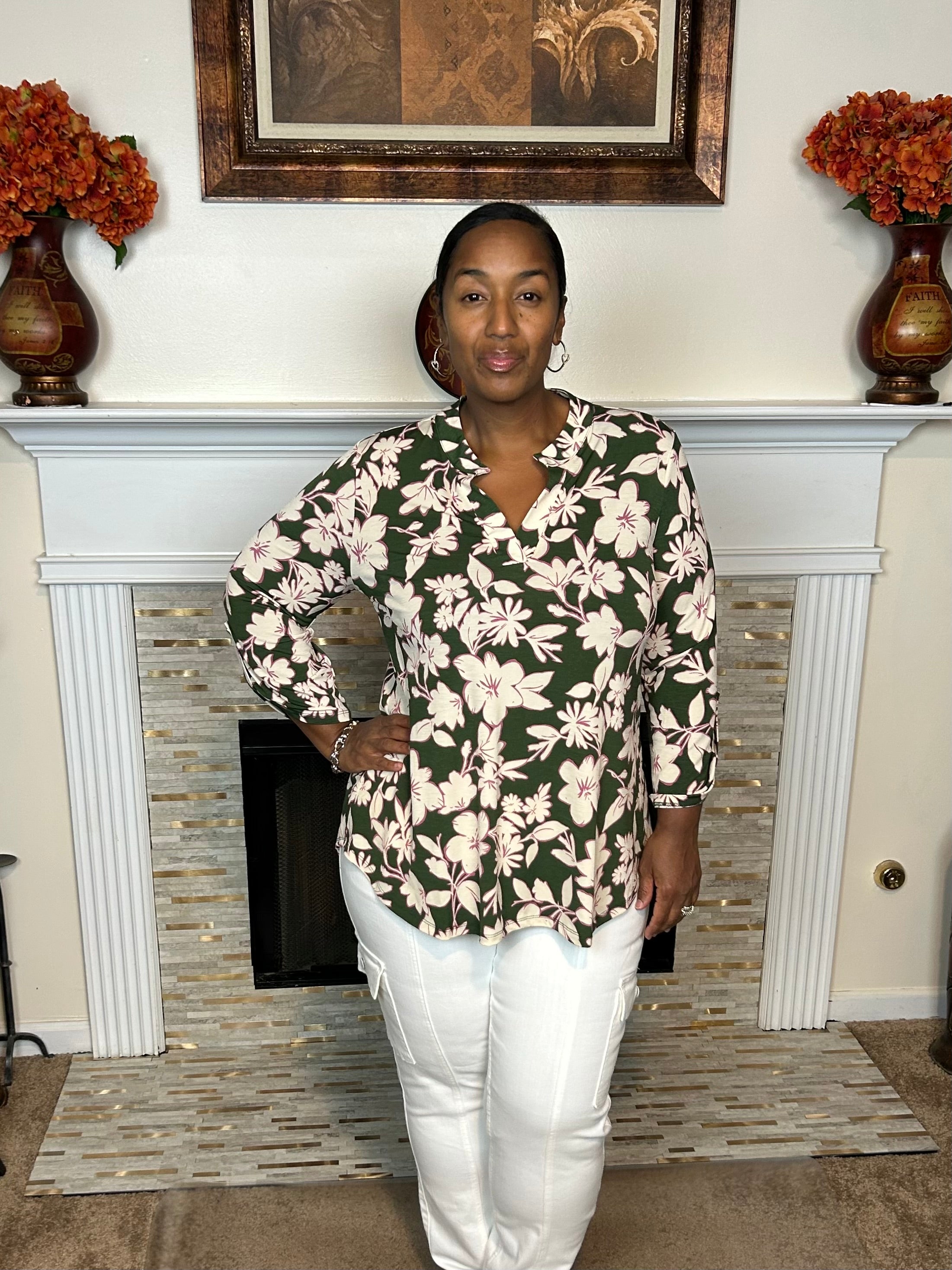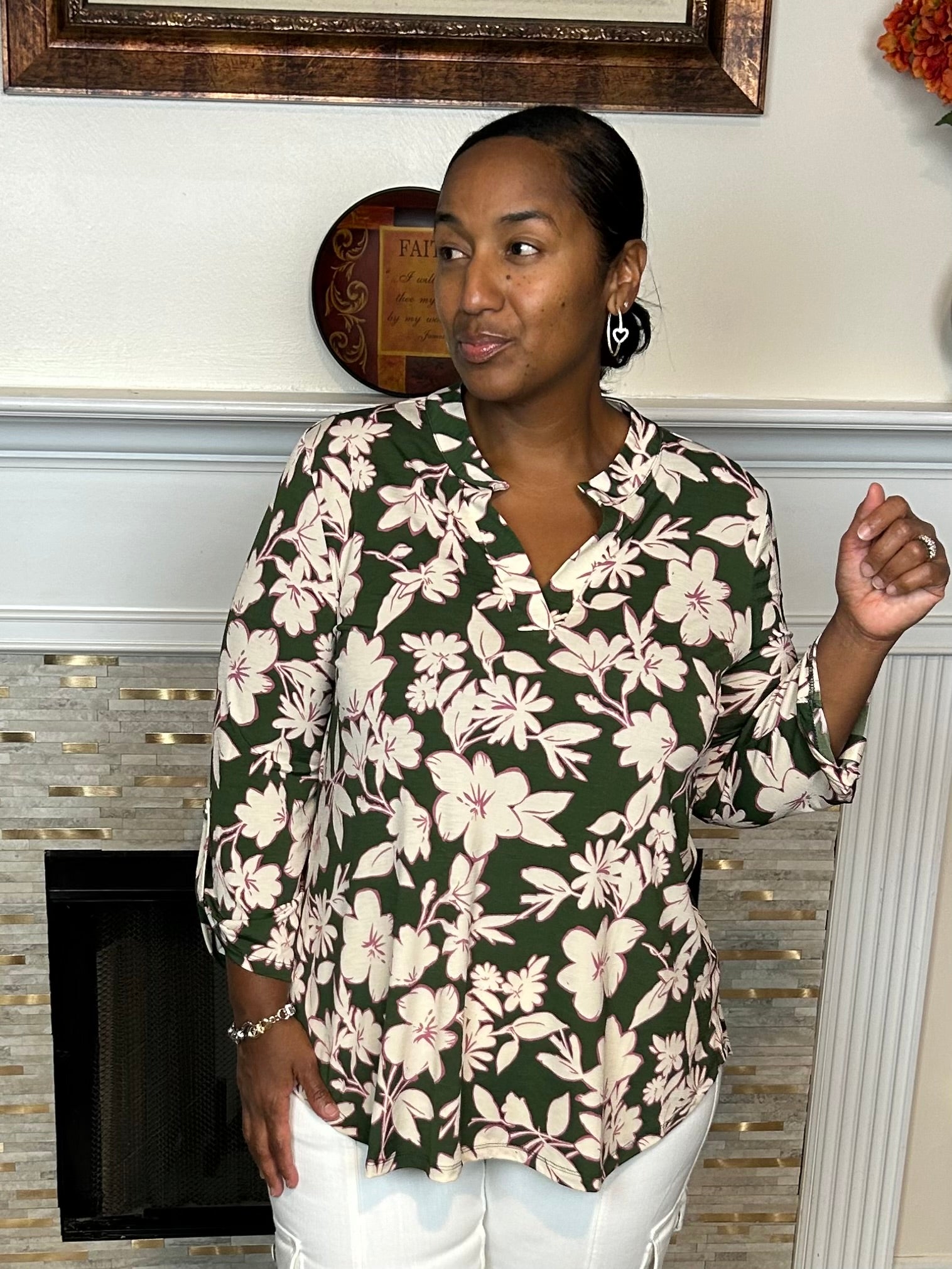 The top your suitcase has been begging for. Our Lizzy Floral Travel Top in olive and blush brings breezy style, wrinkle-free ease, and all-day comfort—no matter where you're headed. Made from a buttery-soft poly blend, it's cooler than linen, lightweight, and perfect for everything from office days to vacation nights.