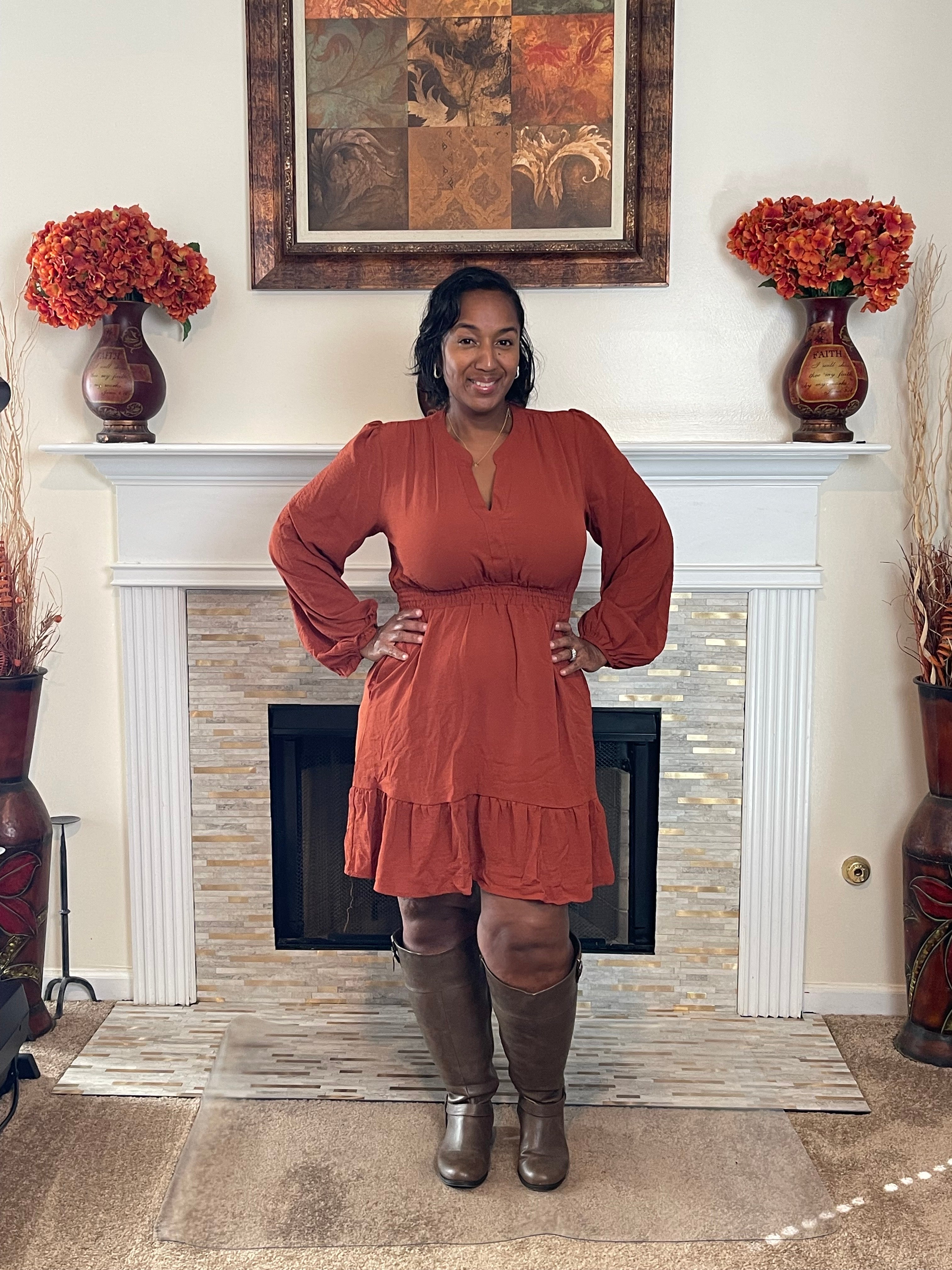 The elastic waist cinches just right without squeezing, giving you shape while keeping things comfortable. Long sleeves add coverage you’ll love, and the lightweight woven fabric drapes beautifully so you can move with ease. And did we mention? Pockets. Because a dress without pockets is just… unfinished.