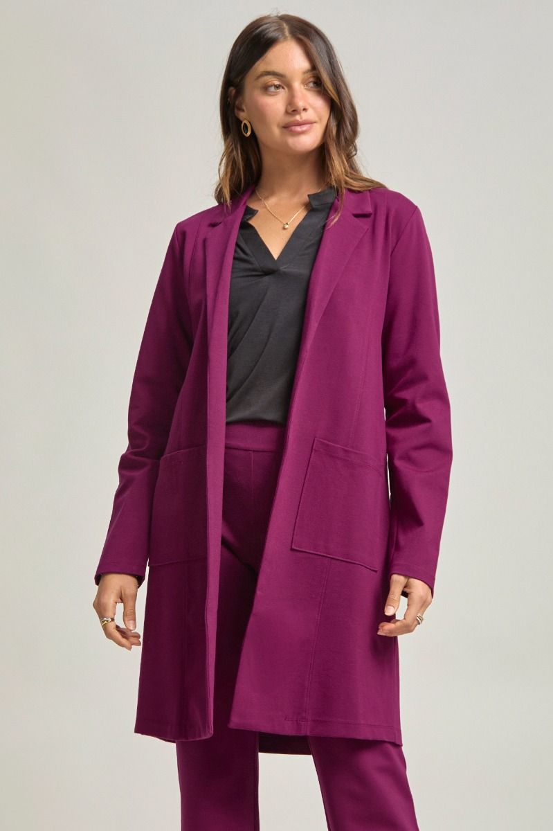 Looking for a layer that does the most with the least effort? Meet the Magic Midi Work Jacket in a rich merlot hue that commands attention without saying a word. Designed in our signature stretch ponte fabric, this longline blazer-style jacket hits at just the right length to flatter your figure while still giving you room to move.