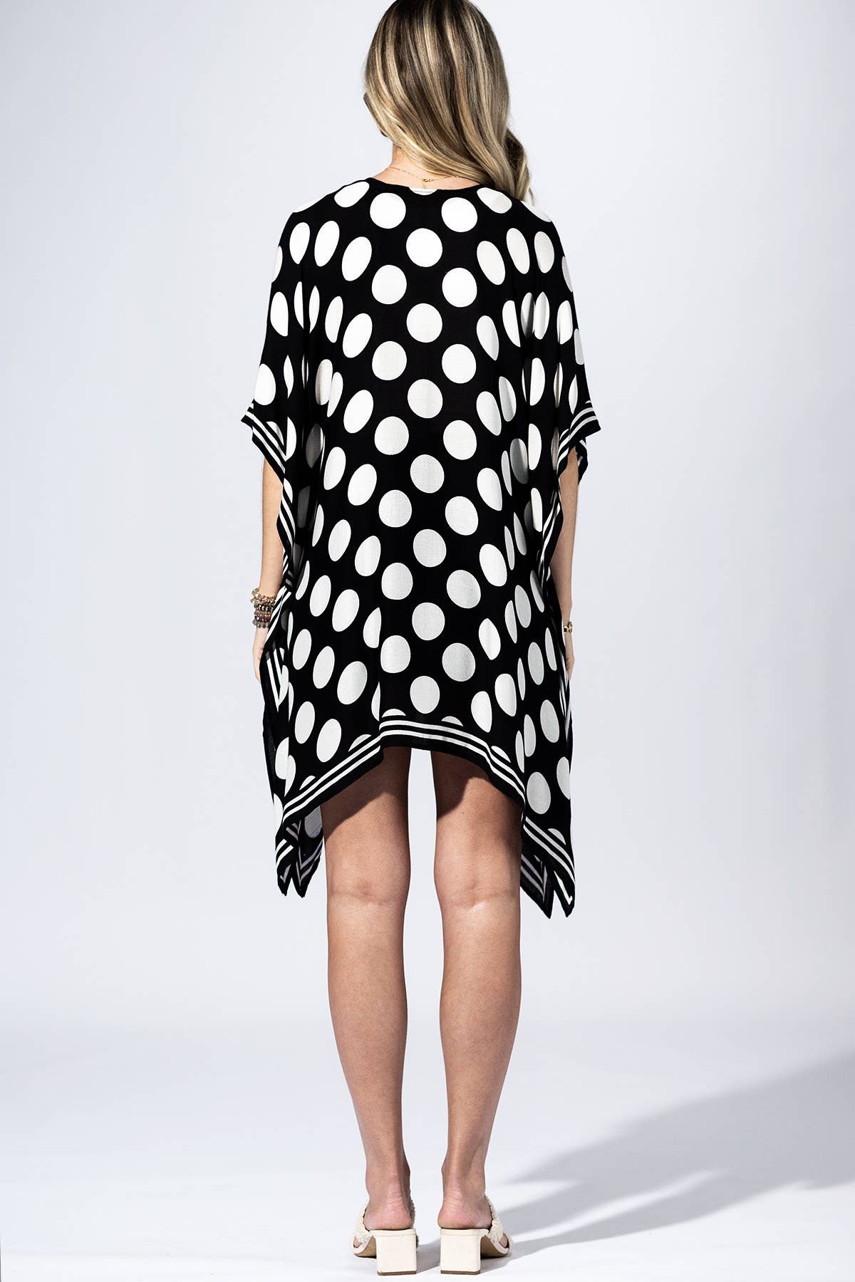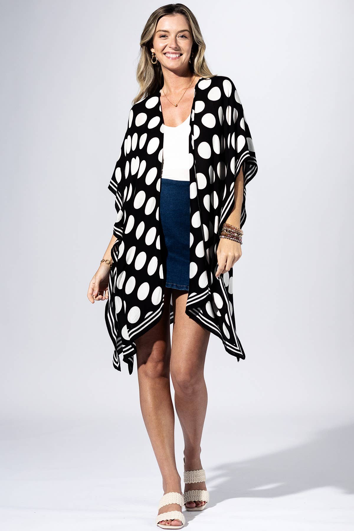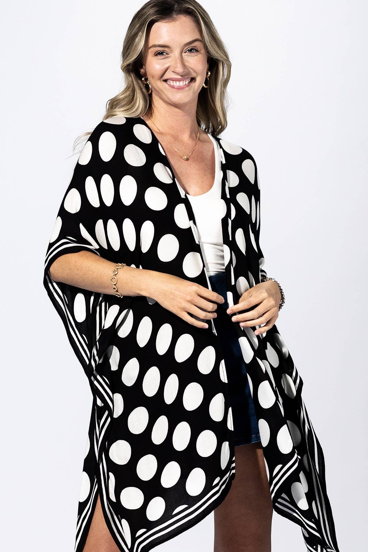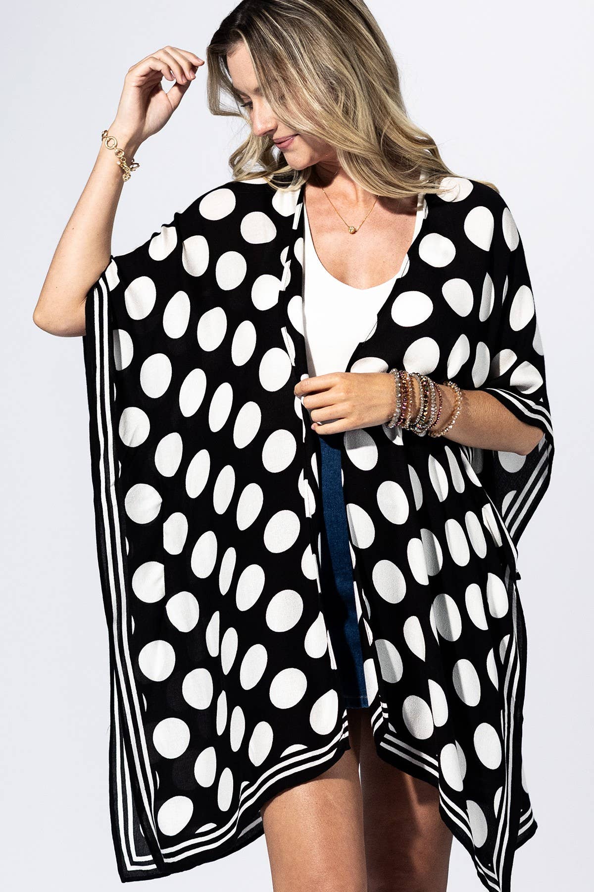 Playful meets polished in the Polka Dot Border Kimono. Designed with oversized ivory polka dots against a sleek black base, this piece brings bold contrast while still feeling timeless. The striped border along the hem and sleeves adds a modern twist, giving it that elevated, eye-catching finish. Lightweight and easy to wear, it drapes effortlessly over your outfit, making it the perfect throw-on layer when you want to look put together without overthinking it.