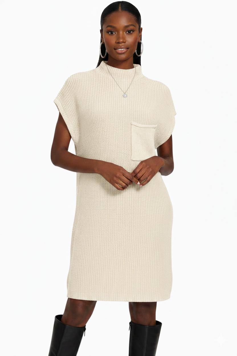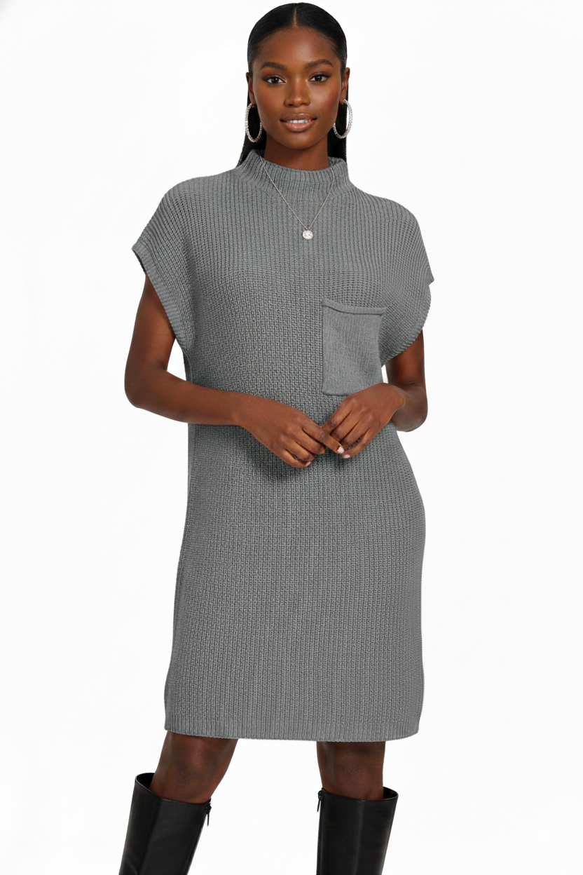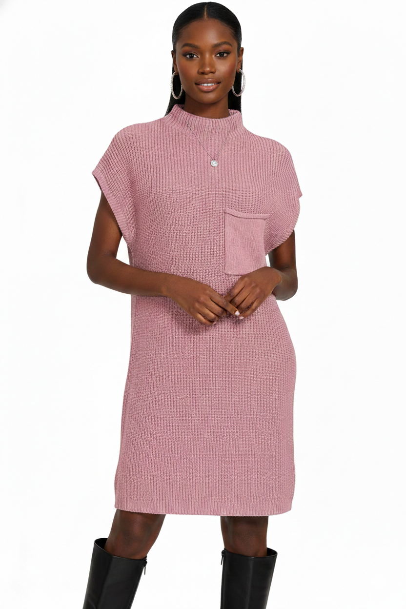 Easy, elevated, and effortlessly wearable — this mock neck short sleeve sweater dress is the definition of cozy polish. Designed with a soft textured knit and a relaxed silhouette, it gives you that “put together without trying” look. The mock neckline adds a modern touch, while the functional front pocket keeps it casual and practical. Perfect for days when you want comfort and style in one simple piece. Jeannine wears a large.