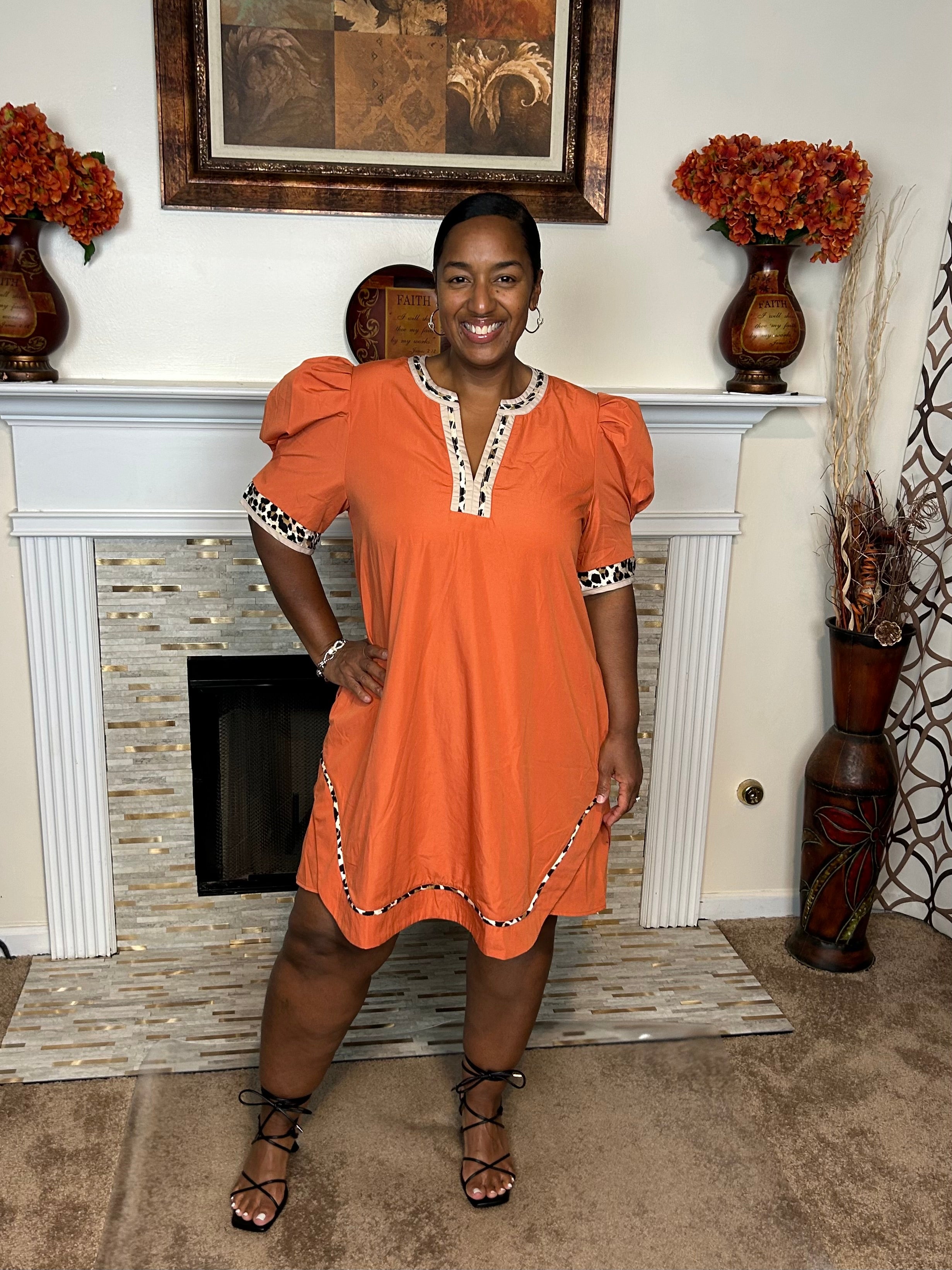 The Puff Sleeve Animal Trim Mini Dress is giving bold energy with zero effort. Designed in a sleek black woven fabric, this short dress features puffed pleated sleeves, side pockets, and an unexpected pop of animal print trim along the neckline, sleeves, and hem. Fully lined and lightweight, it’s the perfect “pull it on and go” piece for date nights, brunch, or anytime you want to show up looking effortlessly styled.