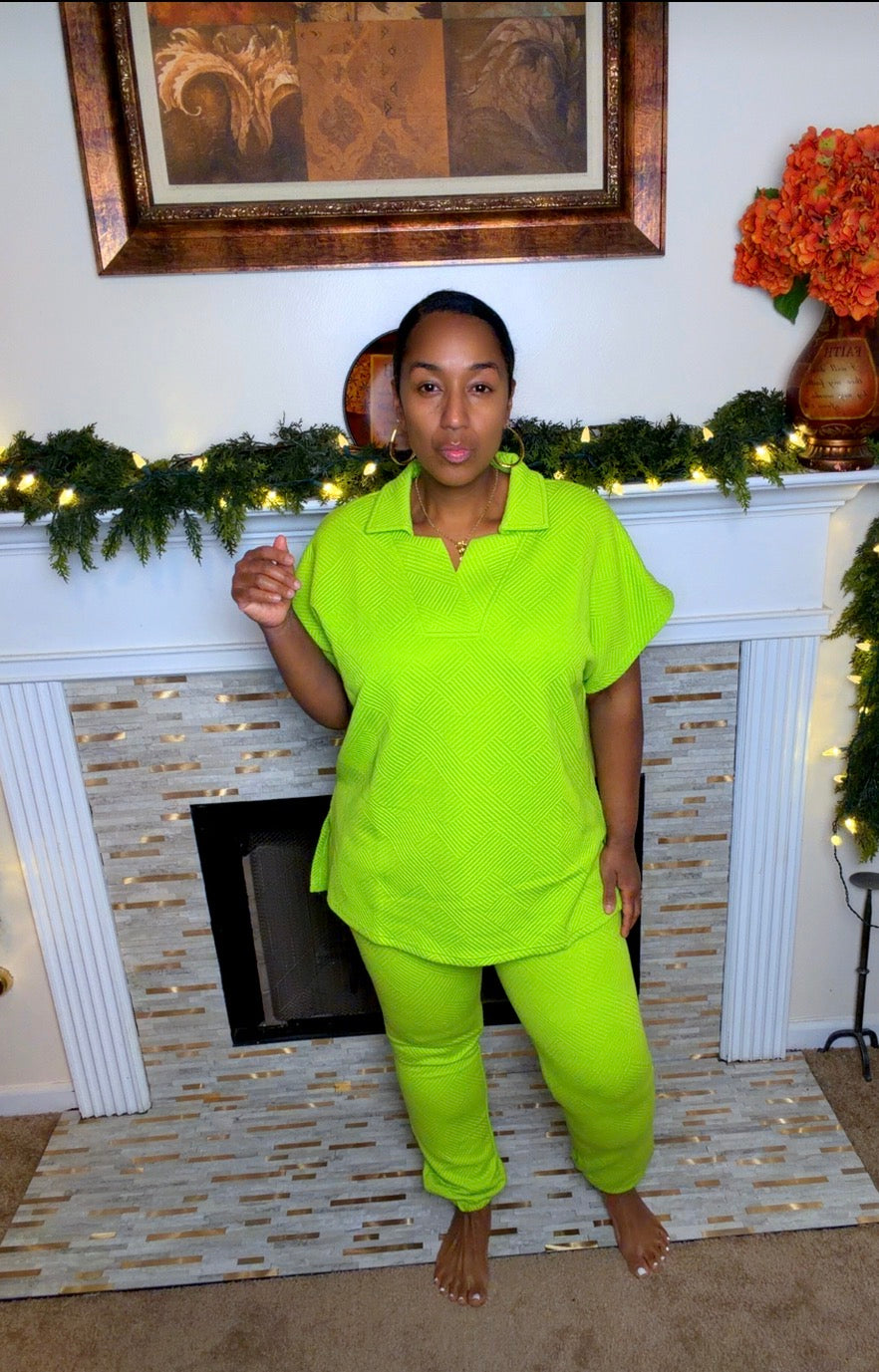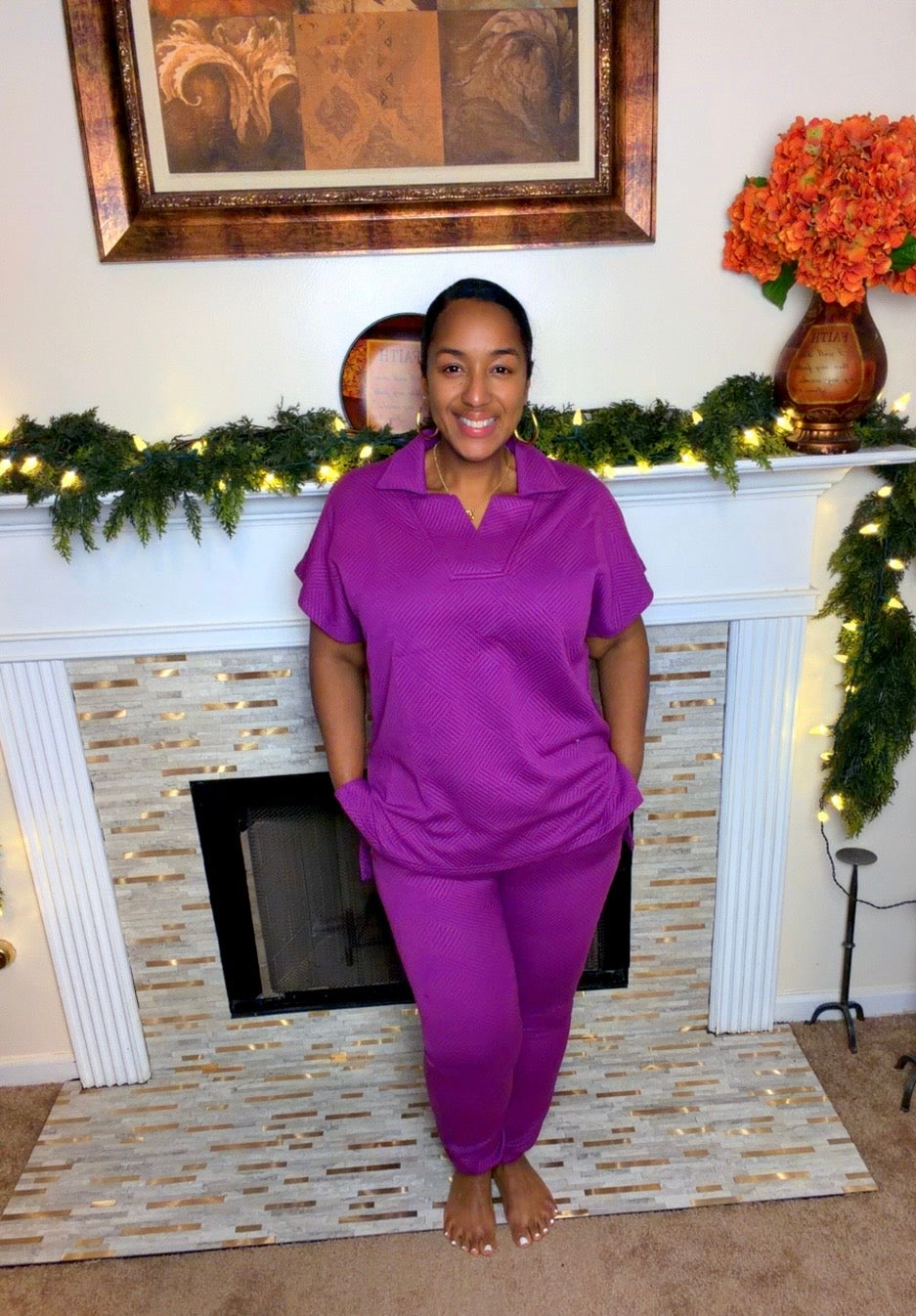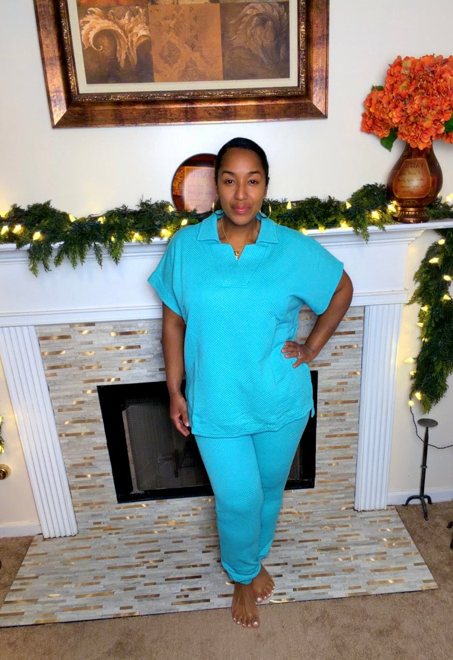 The coordinating pants are designed with a gathered elastic ankle for a clean, modern finish. The textured fabric adds depth and dimension, giving this set that “put together” look while still feeling soft and comfortable against the skin.
