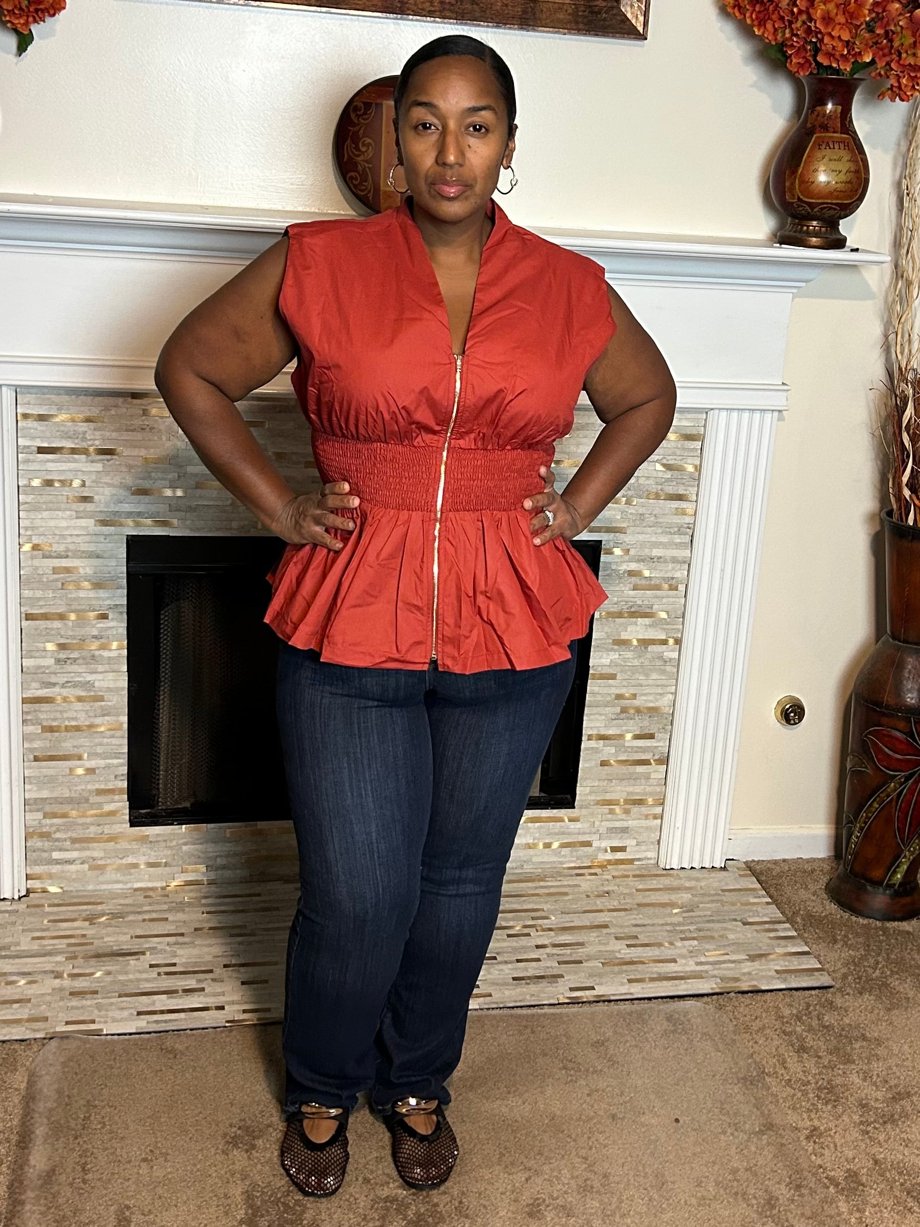 Beauty, this top is all about effortless shape without the squeeze. With a wide smocked waist that flatters every curve and a playful peplum hem, it’s giving polished and comfortable. The zipper front adds just the right amount of detail, while the lightweight woven fabric keeps it breathable and easy to wear all day.