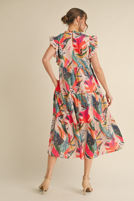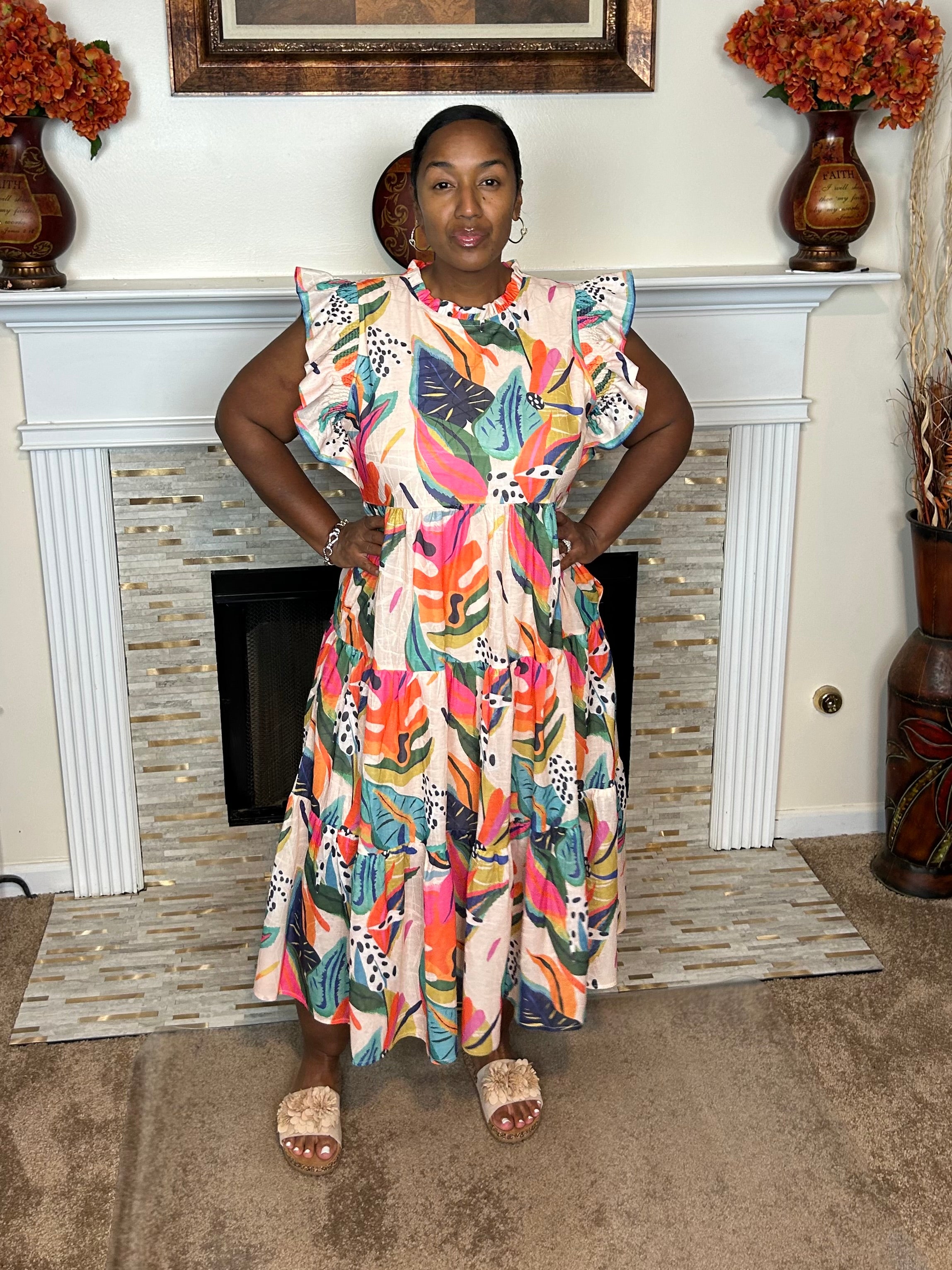 The Tropical Vibes Midi Dress brings bold energy and breezy comfort together in one perfect piece. With ruffled cap sleeves, a relaxed tiered fit, and an explosion of tropical floral color, this midi dress is your warm-weather go-to for brunch, beach days, vacations, or casual slay days.
