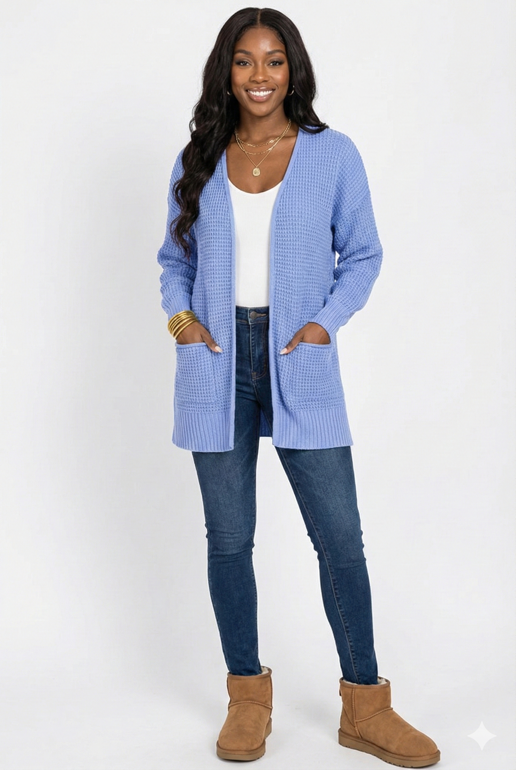 Crafted from soft, high-quality acrylic with a signature waffle-knit pattern, it’s perfect for tossing over your favorite leggings, sets, or dresses. Whether you’re lounging at home or stepping out for errands, it adds instant comfort and casual polish.