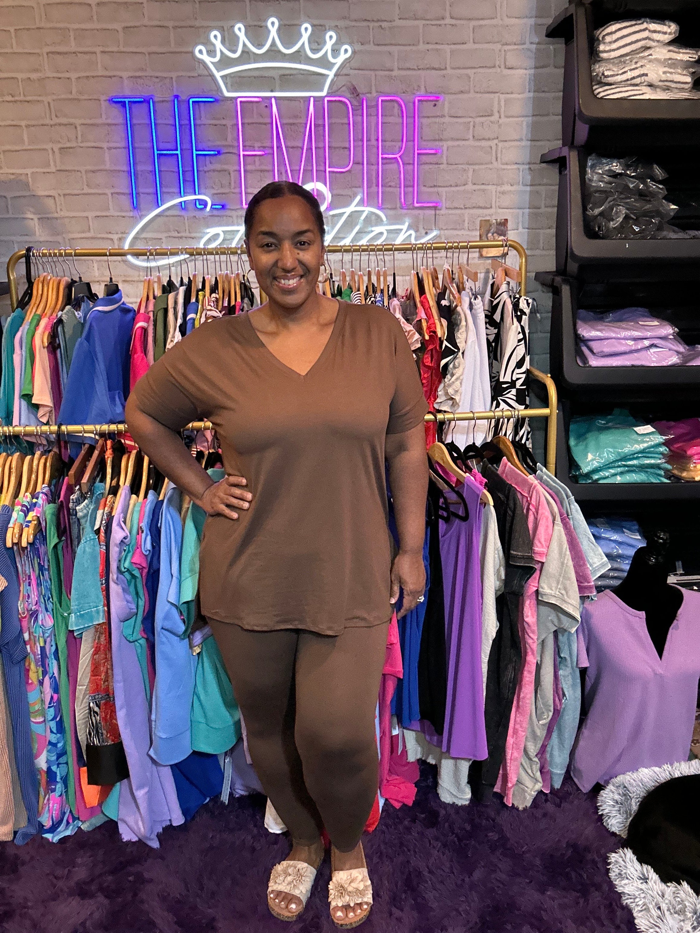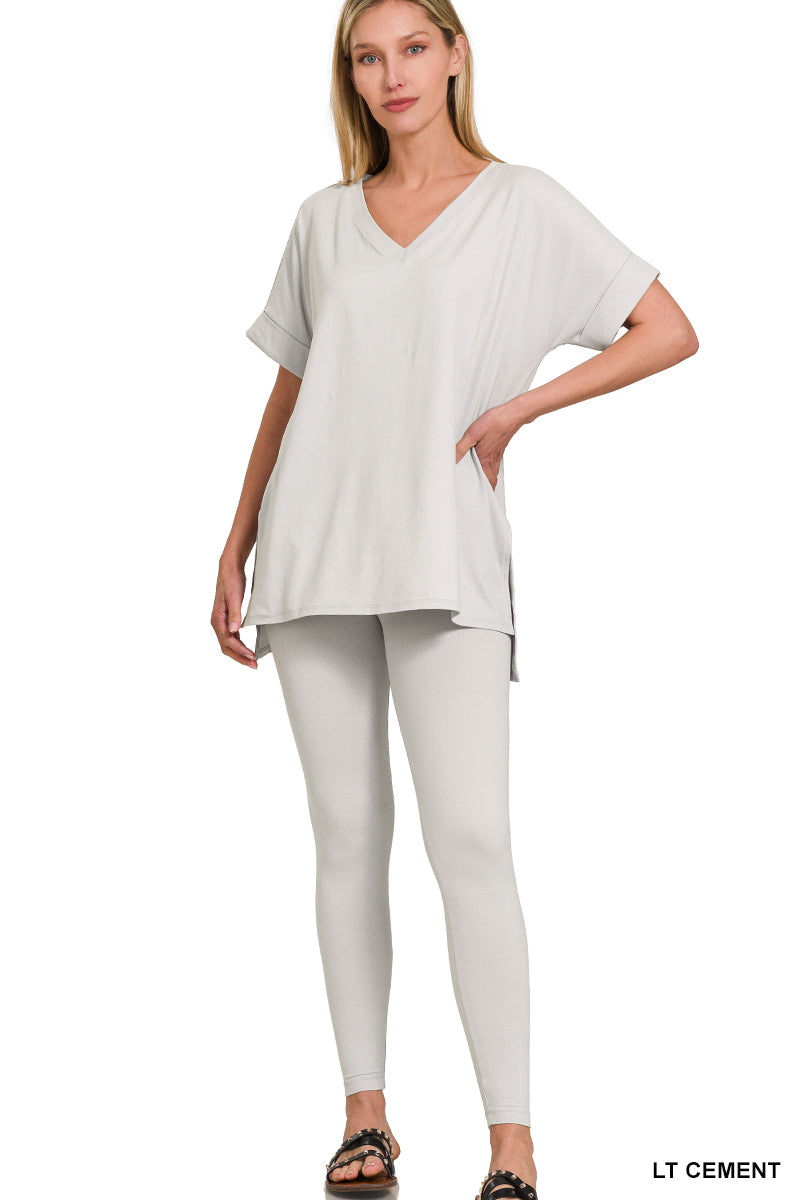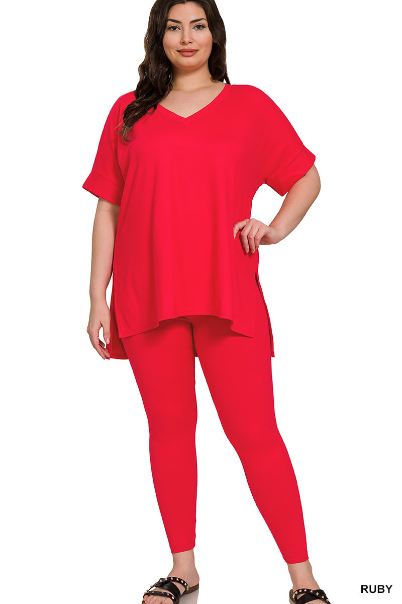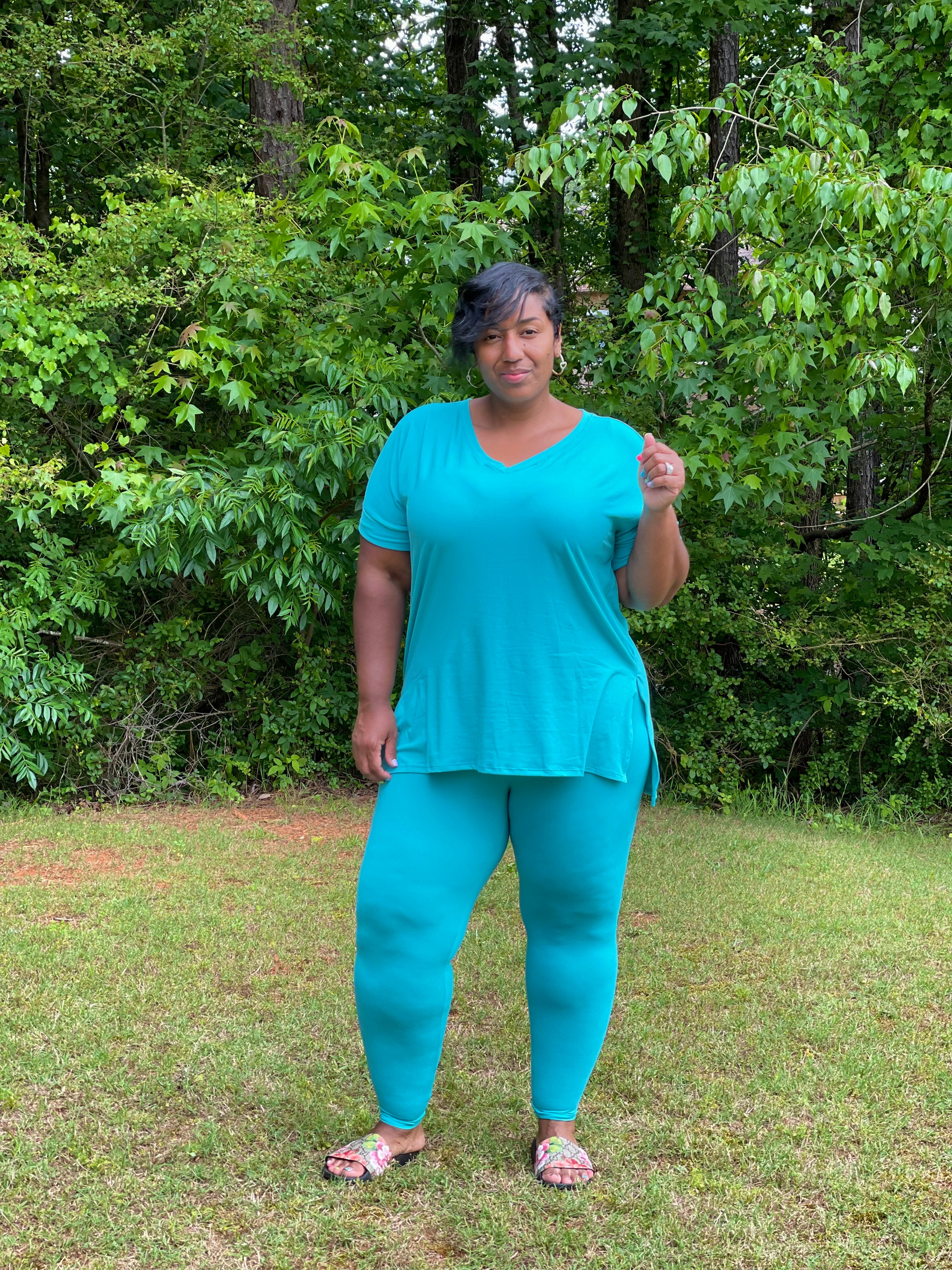 This set runs oversized for that comfy, effortless vibe we love—but you can absolutely size down for a more fitted look. The top has great stretch, so it’ll still move with you even if you go down a size. If you're busty up top or curvier through the hips, stick with your regular size for the best overall fit. Made with a soft, flexible polyester-spandex blend that gives you all-day comfort without sacrificing style. Jeannine is rocking a size Large for a more fitted look and an XL for a flowy look.